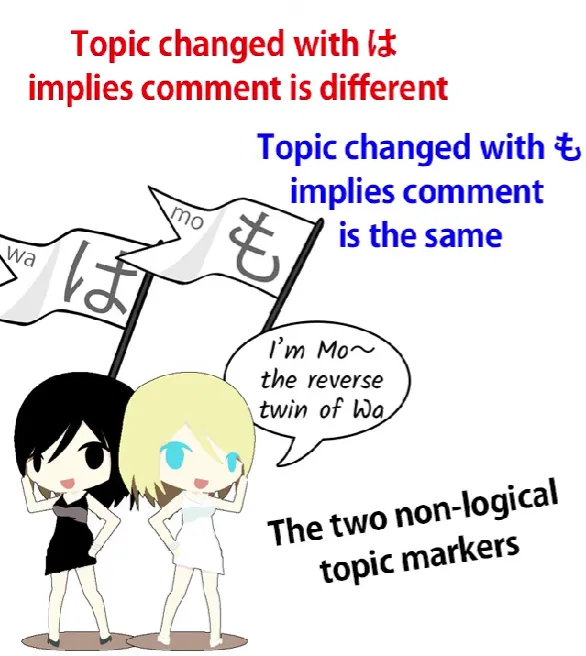 Lorsque nous changeons de thème en utilisant は, nous disons implicitement que le commentaire sur le nouveau thème est différent du commentaire sur l'ancien thème. Si nous voulons dire que le commentaire est le même, alors nous devons utiliser l'autre marqueur de thème, も (mo).
