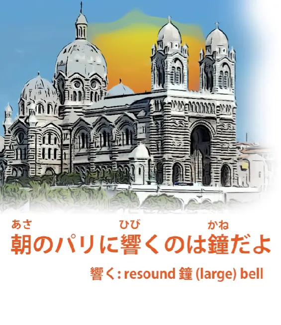Donc, cela vient d'une chanson de Disney, Les Cloches de Notre-Dame, et la première ligne est 朝のパリに響くのは鐘だよ (Asa no Pari ni hibiku no wa kane da yo).