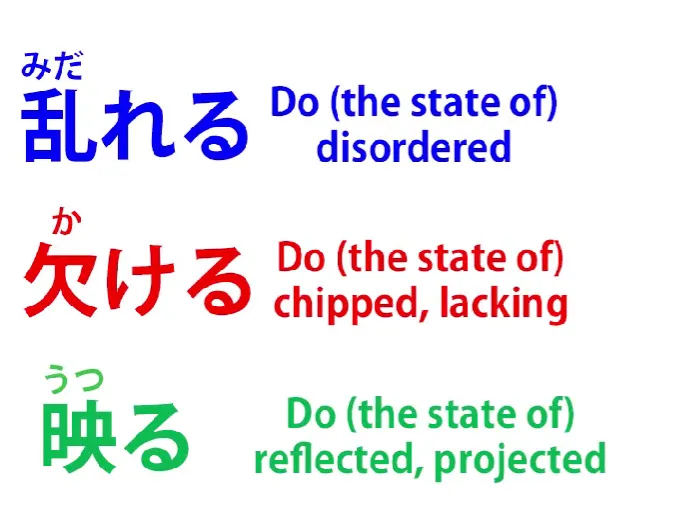 Par exemple, 乱れる (Midareru) — être dispersé ou désordonné (to be scattered or disordered); 欠ける (Kakeru) — être ébréché ou endommagé ou insuffisant (to be chipped or damaged or insufficient); 映る (Utsuru) — être réfléchi ou projeté (to be reflected or projected).