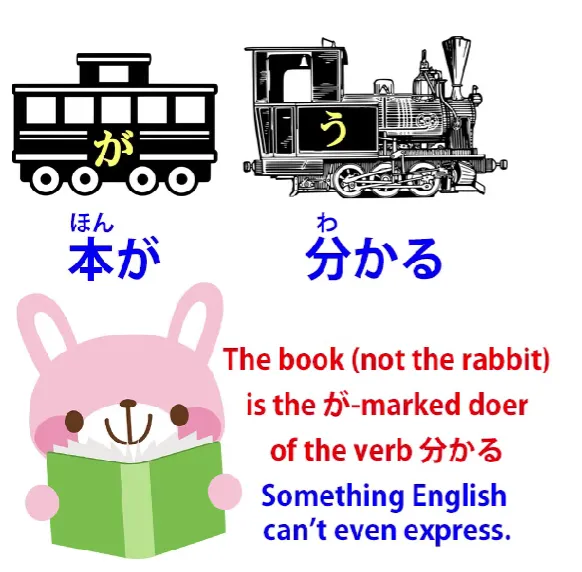 Et nous pouvons commencer par quelque chose qui n'est en fait généralement pas traduit comme passif, mais qui serait un peu mieux si c'était traduit comme passif, et c'est quelque chose que nous avons déjà examiné dans un autre contexte, à savoir que si nous disons 本が分かる (Hon ga wakaru), ceci est traduit en français par Je comprends le livre et cela ne signifie pas cela du tout, car comme nous pouvons le voir, le livre est le sujet marqué par が de la phrase.
