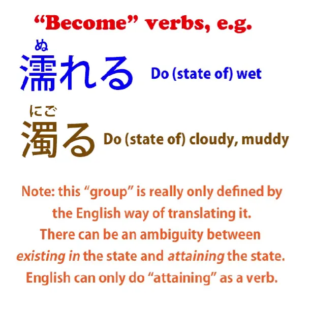 Et puis il y a un autre groupe de verbes qui est étroitement lié à ce type, dans lequel ils sont traduits comme devenir une chose particulière : 濡れる (Nureru) — devenir mouillé (to become wet); 濁る (Nigoru) — devenir trouble ou boueux (to become cloudy or muddy).