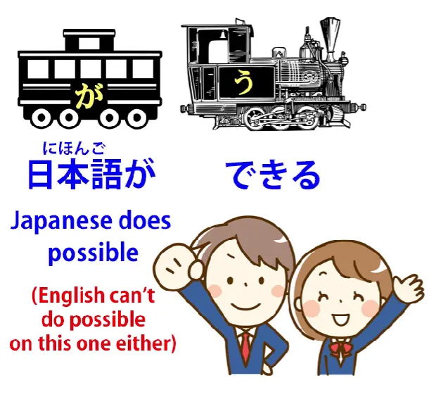 c'est traduit par Je peux faire le japonais ou Je peux parler japonais, ce qui est encore plus étrange car il n'y a pas de parler là-dedans et ce que cela dit réellement, c'est que le japonais est possible (pour moi), mais encore une fois, c'est une construction A-est-B alors qu'en fait, il s'agit vraiment d'une phrase A-fait-B. Ce qu'il dit est Le japonais fait possible (pour moi).