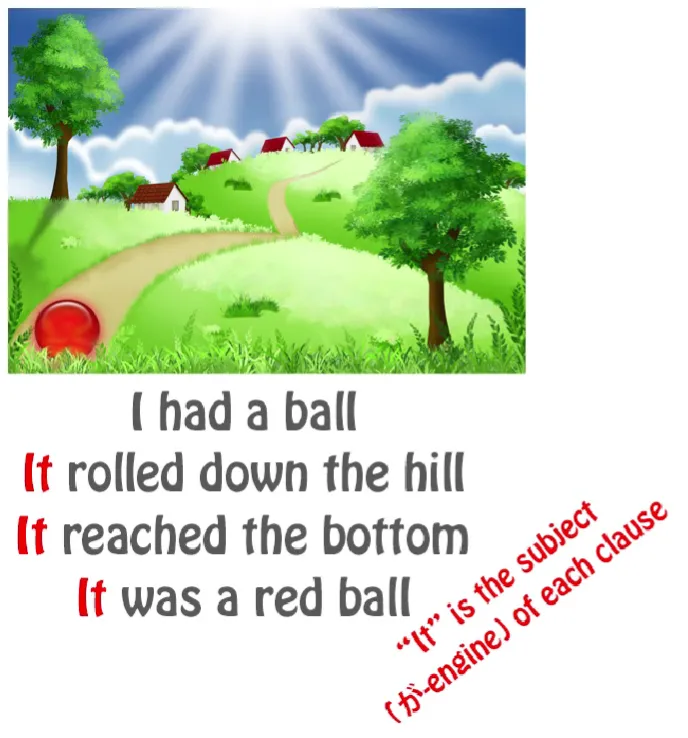 Comme vous le voyez, à chaque fois, la balle est marquée par elle ou c'est, et vous pourriez dire que ce qui est suivi ici est le sujet, parce que c'était la balle qui a roulé en bas de la colline, c'était la balle qui a atteint le fond, c'était la balle qui était rouge.