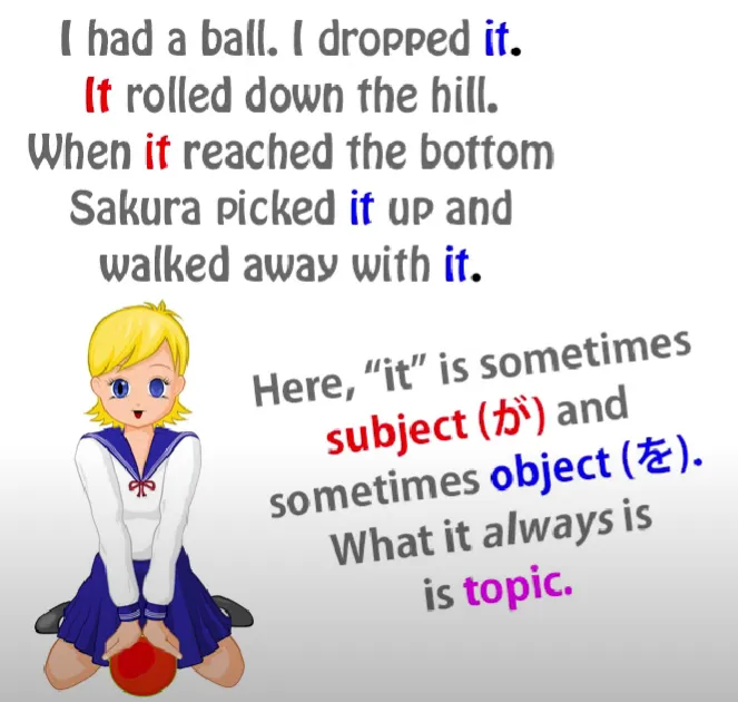 Mais nous pourrions aussi dire : « J'avais une balle. Je l'ai laissée tomber. Elle a roulé en bas de la colline. Quand elle a atteint le fond, Sakura l'a ramassée et s'en est allée avec elle.»