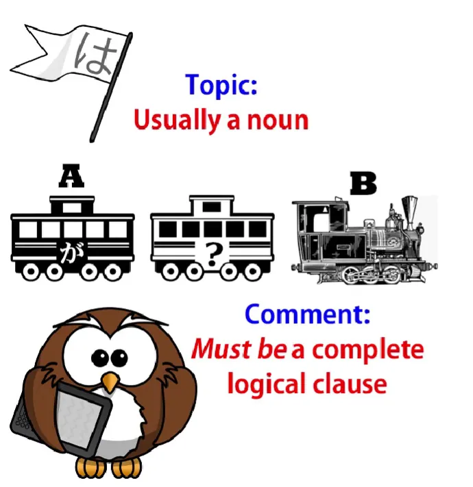Mais ce n'est pas ce que c'est : c'est une nécessité logique. Comme nous le savons, chaque phrase, chaque proposition logique, doit avoir une voiture A et un moteur B, un sujet et un prédicat, et comme nous le savons depuis notre troisième leçon sur は, は ne peut jamais marquer ni la voiture A ni le moteur B, ni aucun autre élément d'une phrase logique. Il ne peut marquer que le thème non logique.
