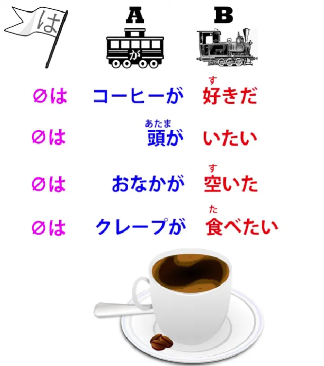 Et en japonais, beaucoup plus qu'en français, ils ne le sont très souvent pas. Ainsi, dans des phrases comme コーヒーが好きだ (Kōhī ga suki da), 頭が痛い (Atama ga itai), おなかが空いた (Onaka ga suita), クレープが食べたい (Kurēpu ga tabetai), toutes sont des phrases logiques complètes : Le café est agréable ; La tête fait mal ; L'estomac est vide ; Les crêpes sont vouloir-manger-induisantes.