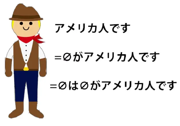 Ainsi, si nous disons アメリカ人です (Amerikajin desu), nous la représentons habituellement comme zeroがアメリカ人です – Je suis Américain, mais pour être complètement exhaustif, nous devrions la représenter comme zeroはzeroがアメリカ人です, c'est-à-dire Je suis le thème, je suis le sujet, et je suis Américain.