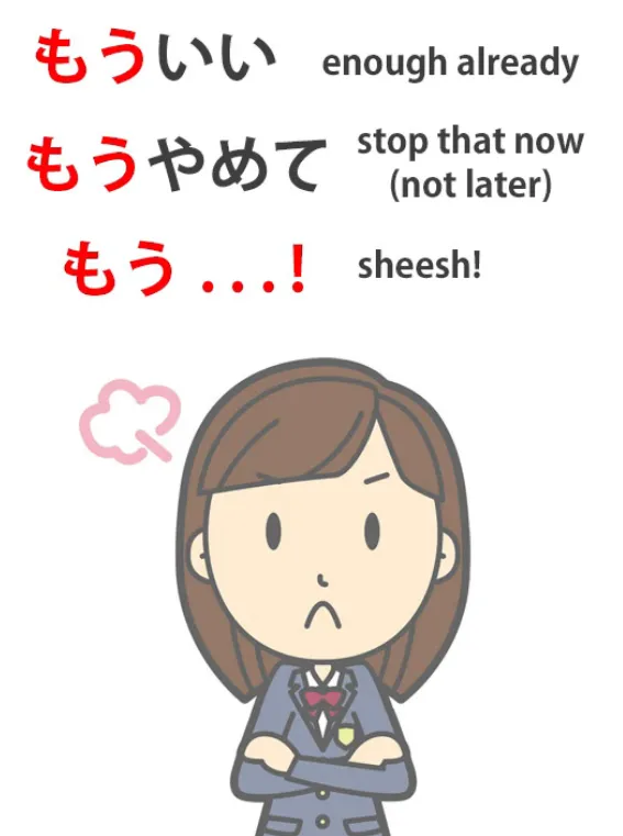 est également utilisé comme une expression d'agacement ou d'exaspération : もう!