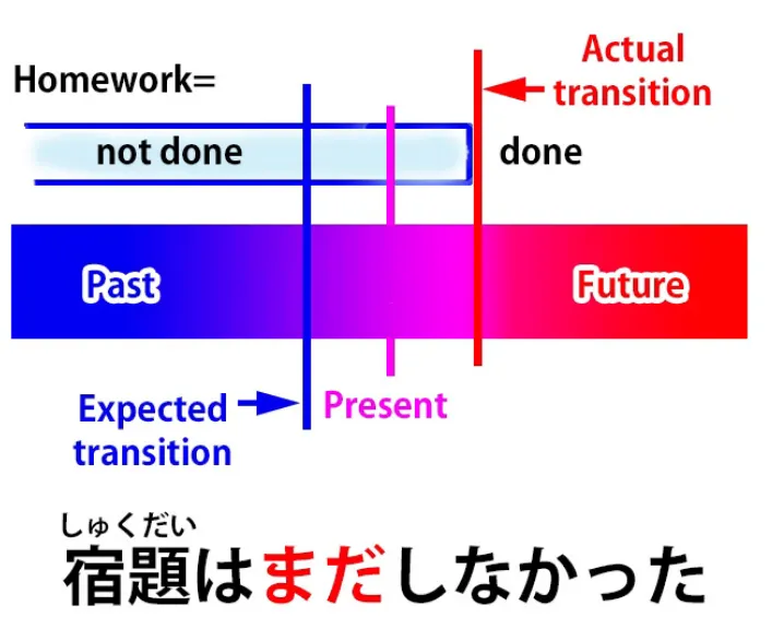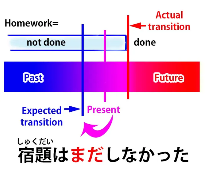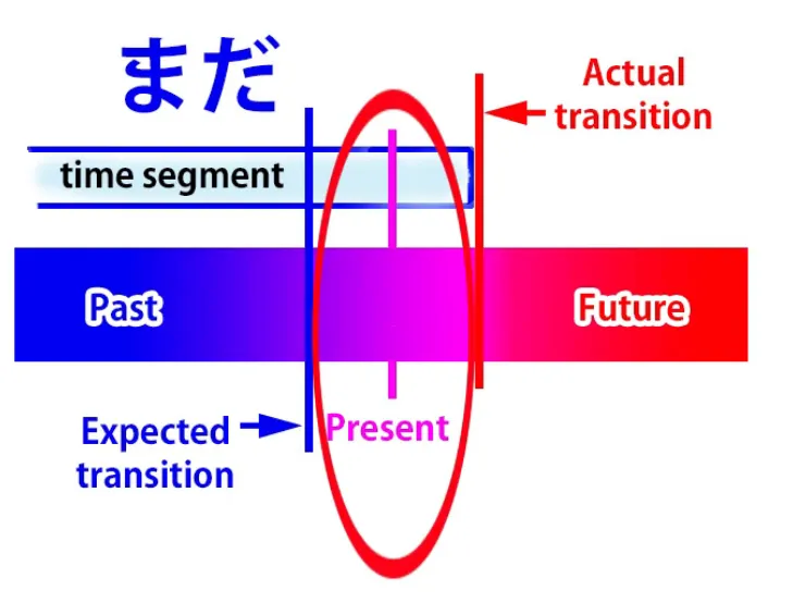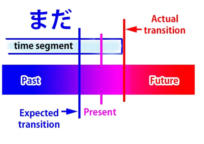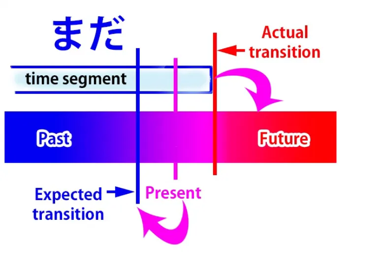 Puisque c'est une section de temps, cela ne peut pas durer éternellement, il y a donc un point de transition auquel cela passe à une autre section de temps avec d'autres qualités qui est attendue dans le futur ou du moins considérée comme une possibilité dans le futur. Or, まだ