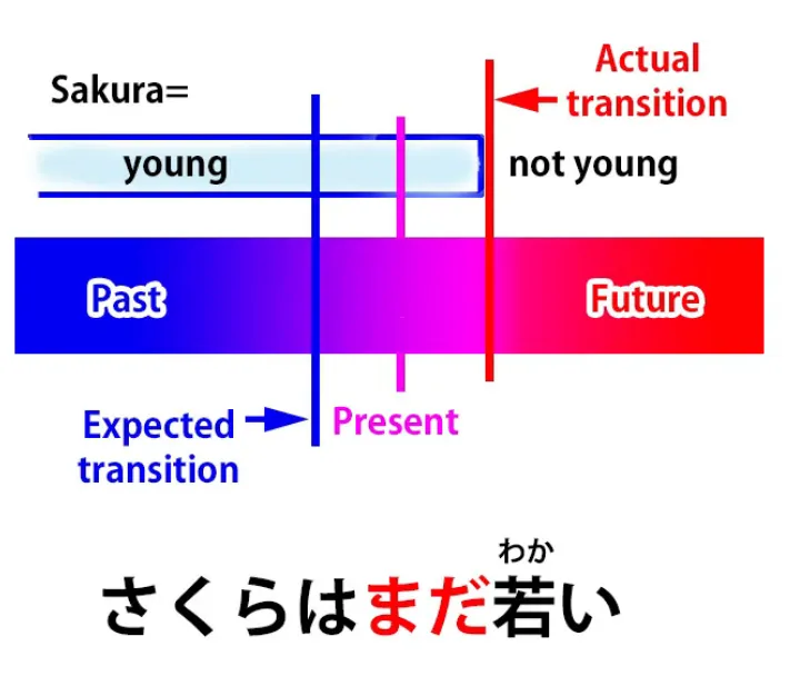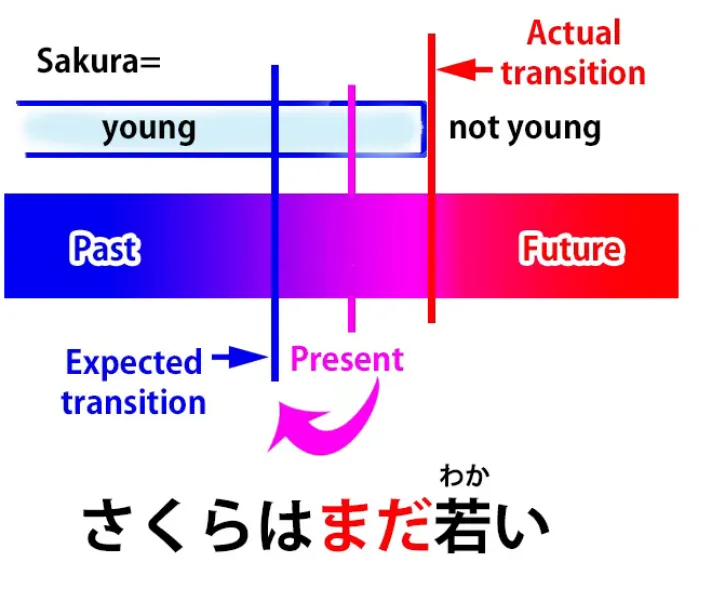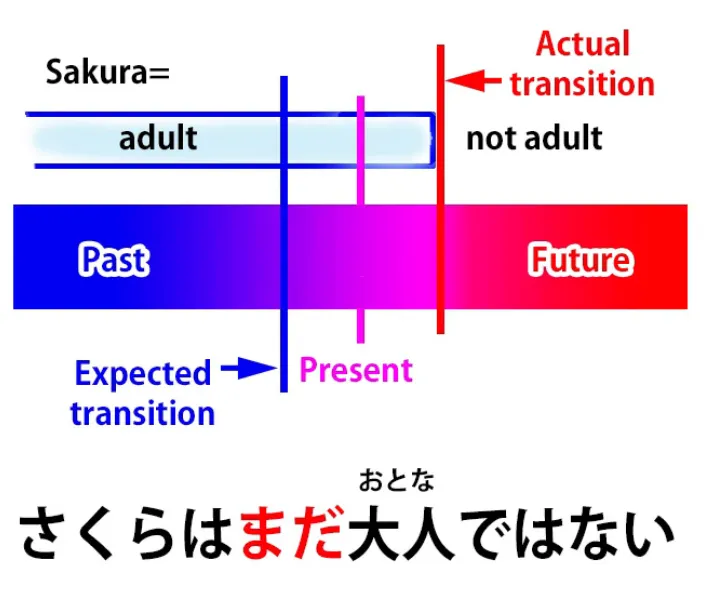 Encore une fois, ce que nous disons est que le temps présent est situé dans une période où Sakura est jeune, que cette période s'étend dans le passé et devrait changer à un moment donné dans le futur. Elle ne sera pas jeune éternellement, elle vieillira. Nous pouvons donc voir que la période de temps pendant laquelle Sakura est jeune est contrastée avec le futur où elle vieillira.