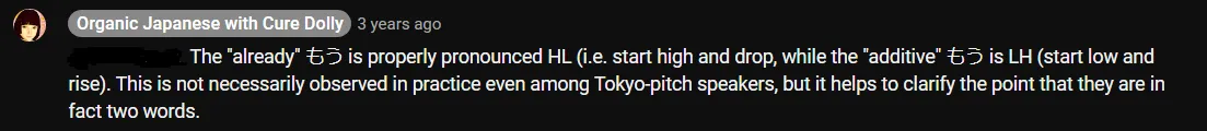 . Or, cela peut être un peu controversé, mais en fait, dans les dictionnaires d'accent de hauteur, ils reçoivent en fait deux accentuations différentes, une pour le もう
