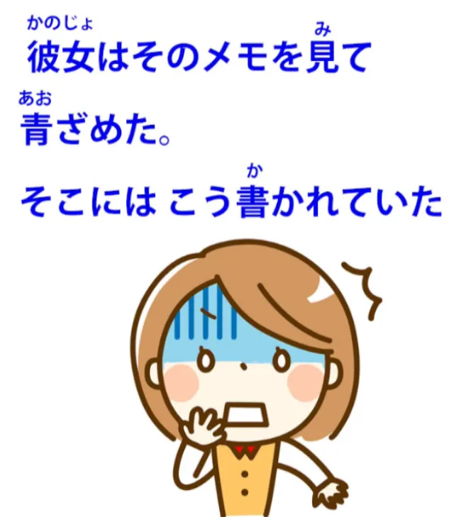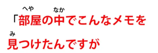(Heya no naka de) — à l'intérieur de la pièce — こんなメモを見つけたんですが… –