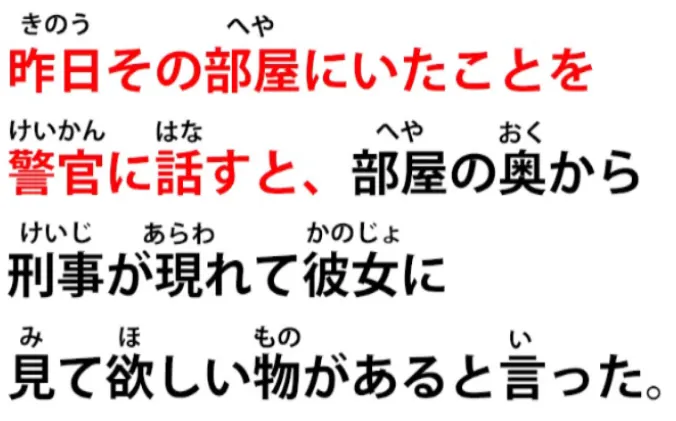 (Kinō sono heya ni ita koto o keikan ni hanasu to) –
