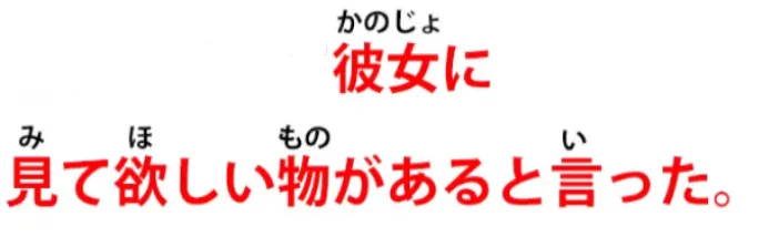 (Kanojo ni mite hoshii mono ga aru) – une chose-veux-qu'elle-voie existe. Il y a quelque chose que je veux que vous regardiez, c'est comme cela que nous le dirions en français. と言った