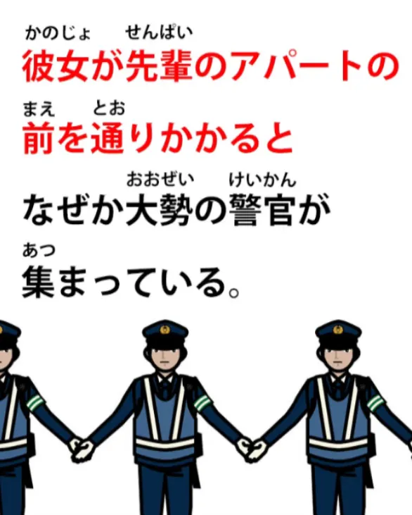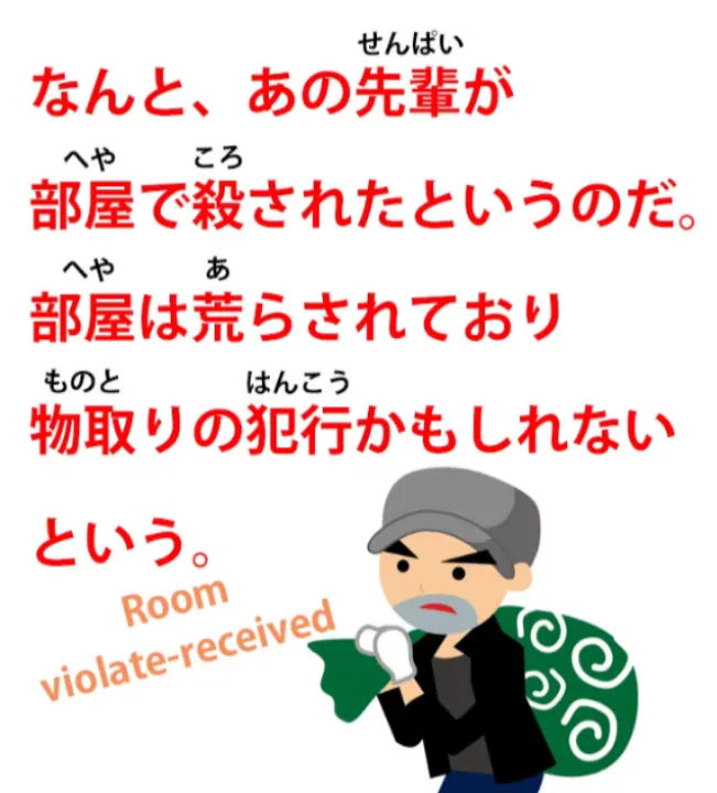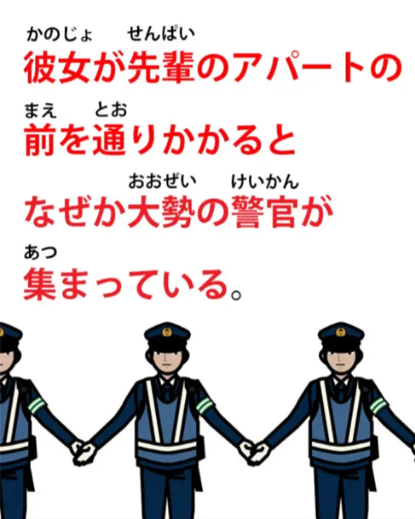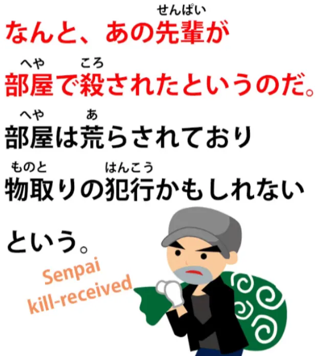 (Nanto ano senpai ga heya de korosareta to iu no da) — Cette senpai, dans cette appartement, a subi l'action d'être tuée.