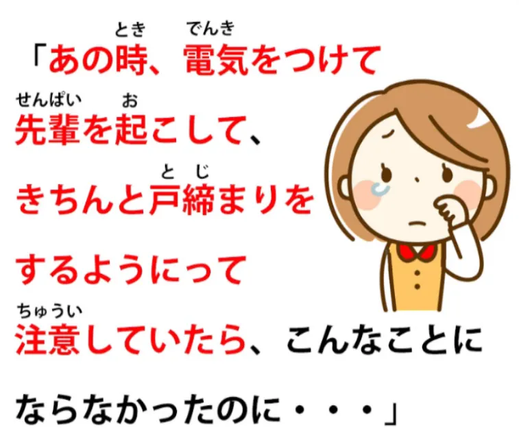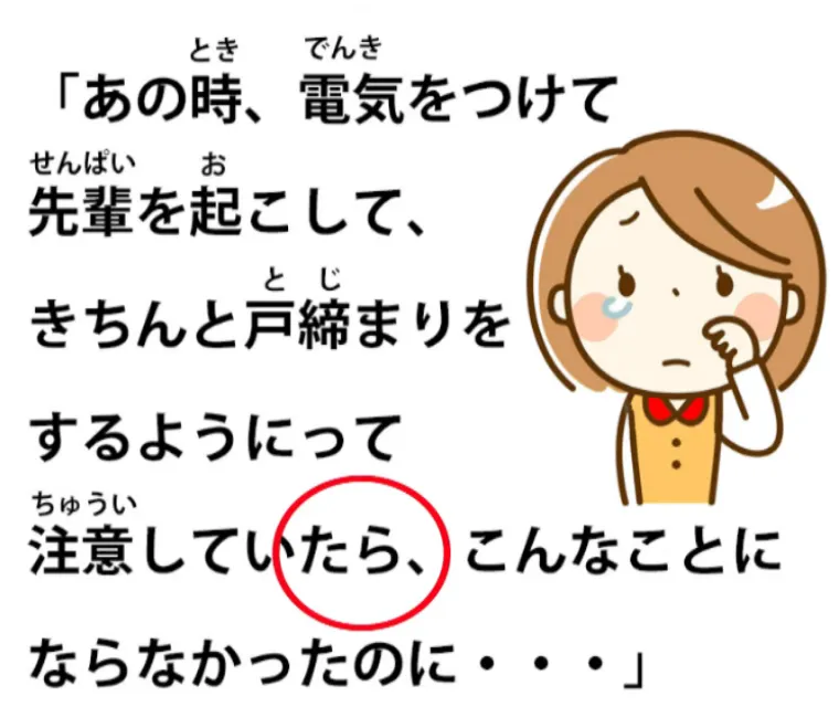 Si elle avait agi avec prudence de cette manière en allumant les lumières, en réveillant senpai, en s'assurant que la porte était correctement fermée — et puis tout cela se termine par le -たら. Si elle avait fait tout ça...