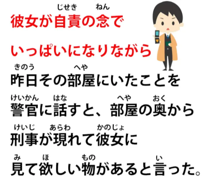 (jiseki no nen) — pensées (ou sentiments) d'auto-blâme. Donc, tout en étant remplie de sentiments d'auto-blâme, 昨日その部屋にいたことを警官に話すと