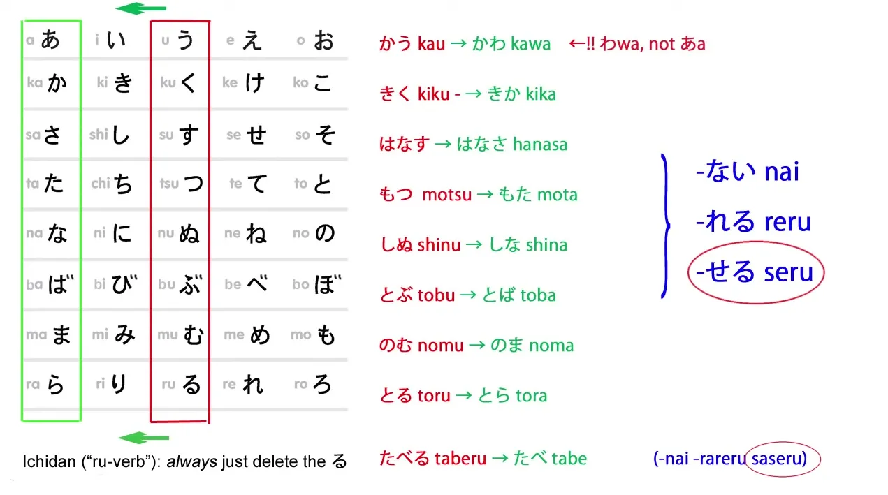 あ (a) | う → あ | ない, causatif せる/させる, passif れる/られる |