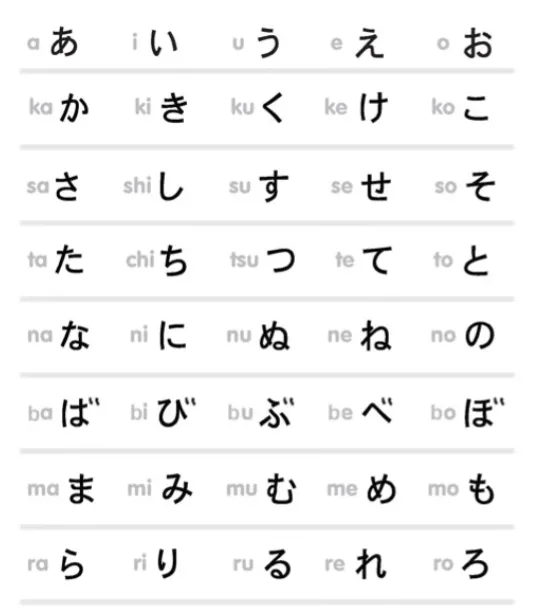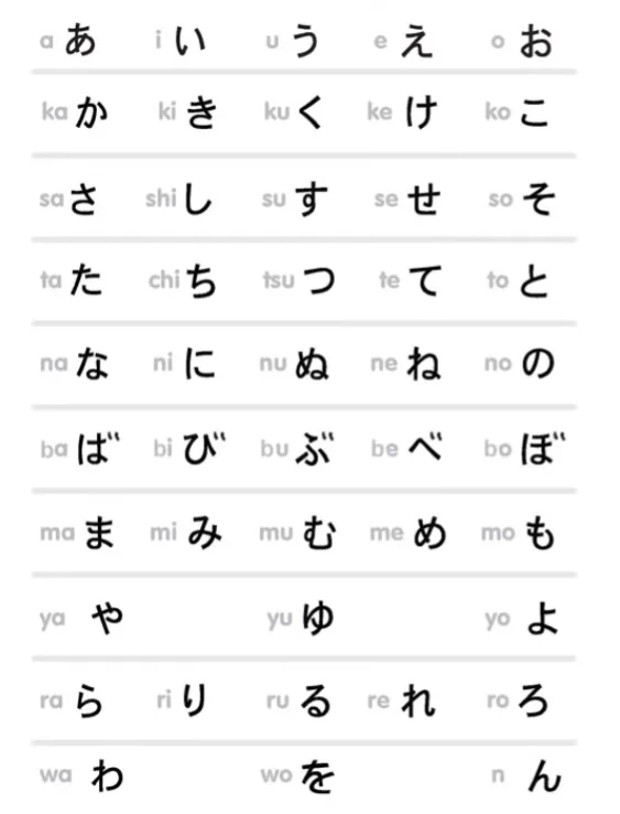 Voici le tableau des kana japonais avec tous les sons.