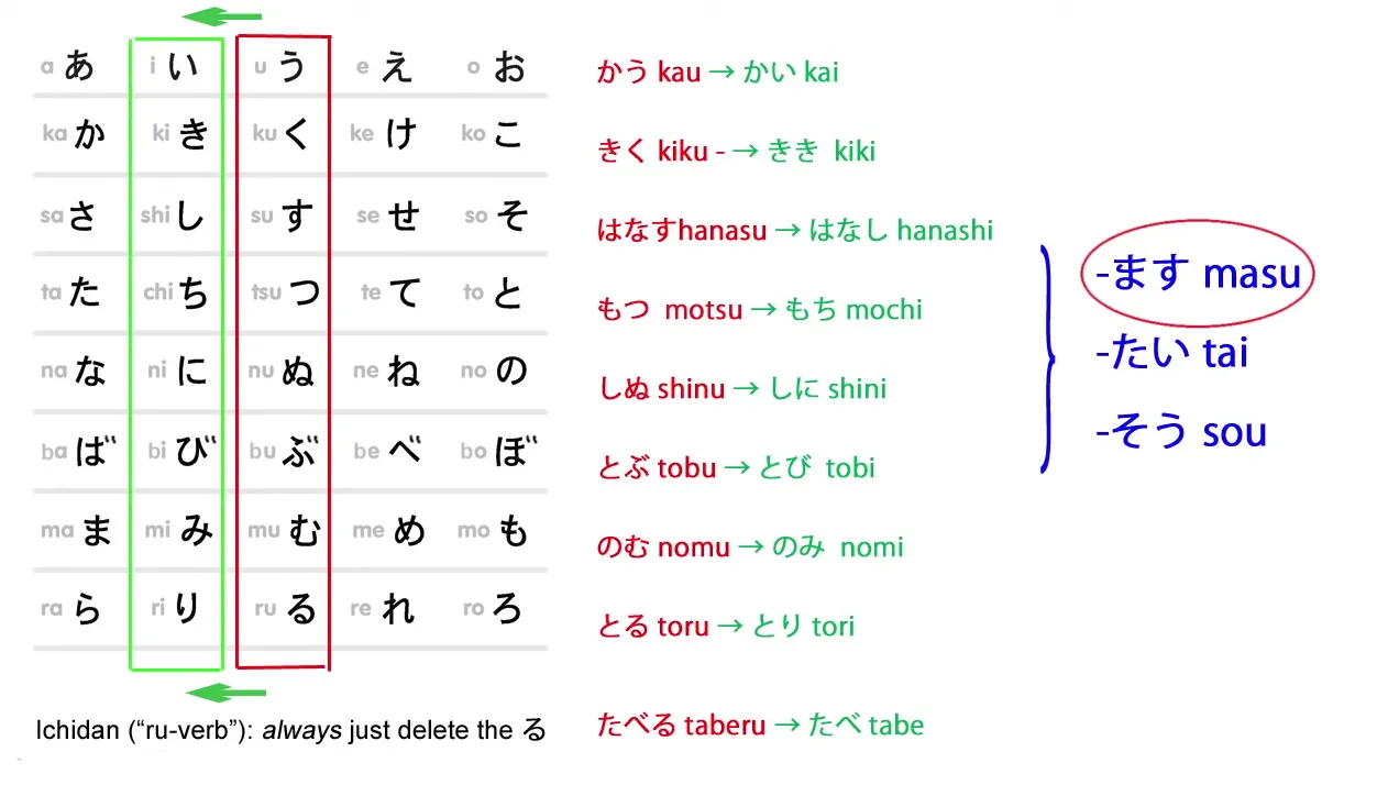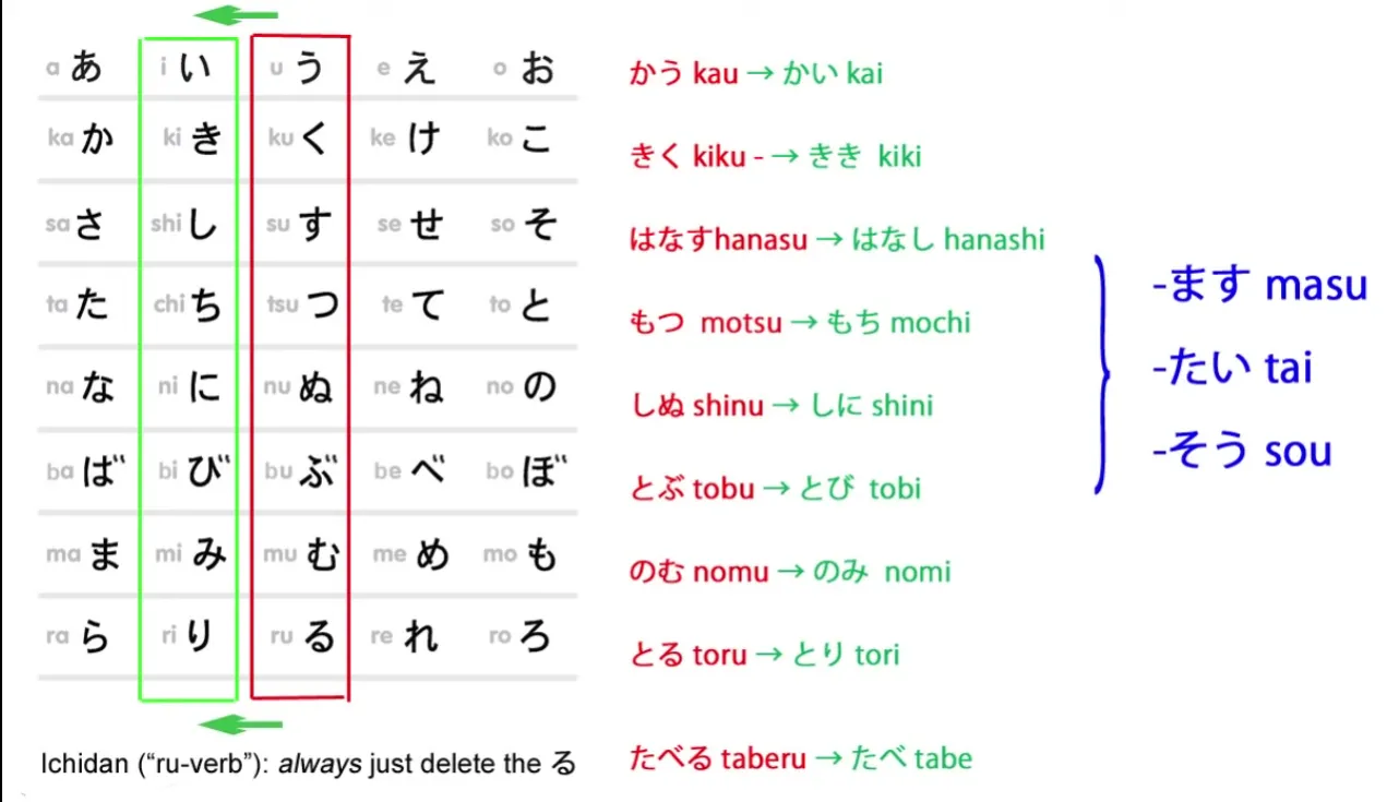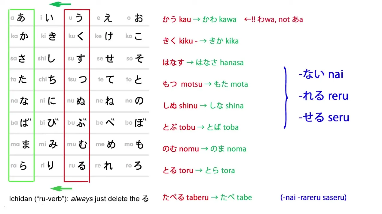 - Les verbes godan changent leur dernière syllabe selon la base désirée : う→い, う→あ, う→え, う→お.