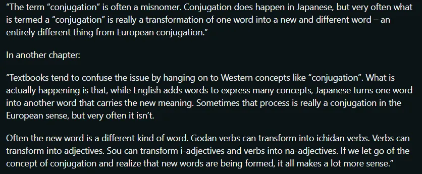 D’un point de vue linguistique, on pourrait dire qu’il existe quelque chose comme la conjugaison en japonais, mais elle semble assez différente des langues européennes, ce qui explique probablement pourquoi Dolly l’évite, afin de ne pas nous faire interpréter cela à l’européenne et nous confondre. Quant à pourquoi la plupart des sources l’appellent conjugaison.