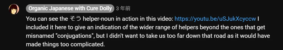 pour acquérir la grammaire ou dans certains titres accrocheurs de ses vidéos. Je ne partage pas cette vision et je la prends avec précaution. Puisque Dolly utilise des explications simples pour faciliter la compréhension, certaines choses qu’elle dit sont simplifiées et adaptées à son modèle, et parfois légèrement inexactes/incorrectes selon certains exemples discutés sur Internet et Discord par des personnes ayant une compréhension plus profonde du japonais.