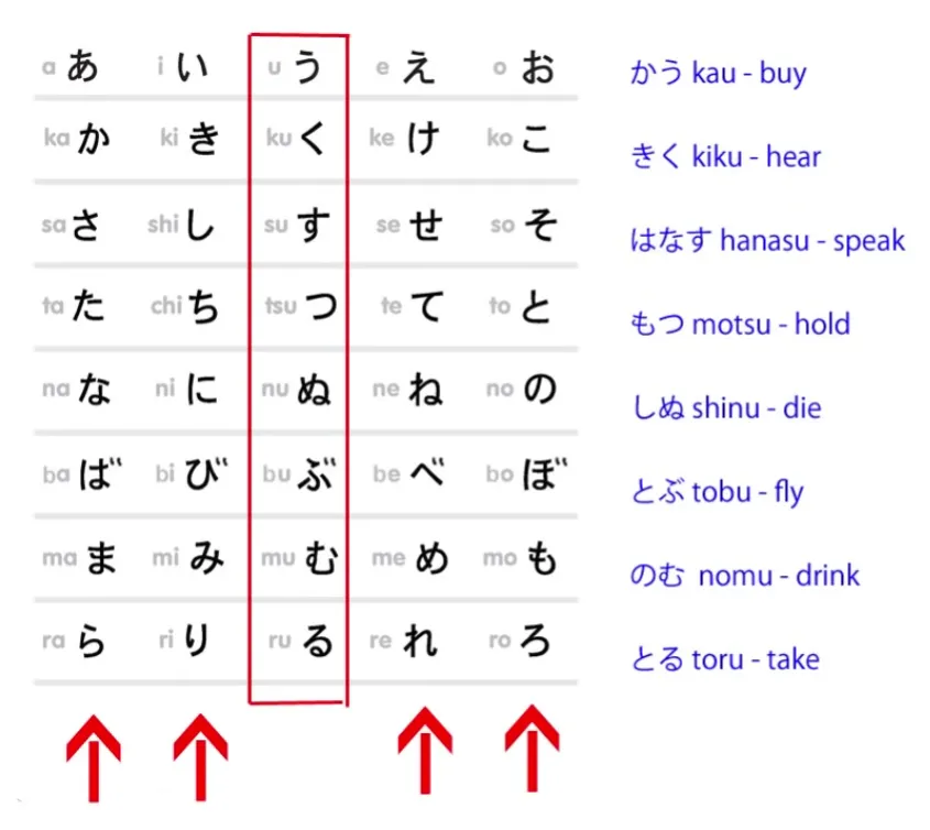 Je l’ai tourné sur le côté. Tous les verbes japonais se terminent par un kana de la ligne centrale, la ligne う – う, く, す, つ, ぬ, etc.