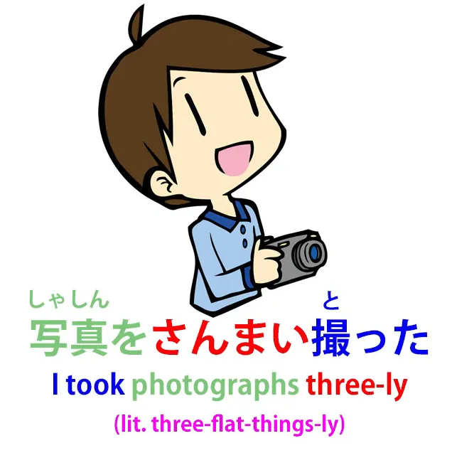 Et c'est pourquoi de telles phrases doivent se terminer par un verbe. Le verbe modifié par un compteur est souvent, comme dans ce cas, le verbe d'être, mais ce n'est pas obligatoire. Par exemple, nous pourrions dire 写真を三枚取った