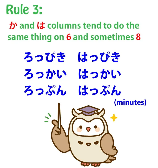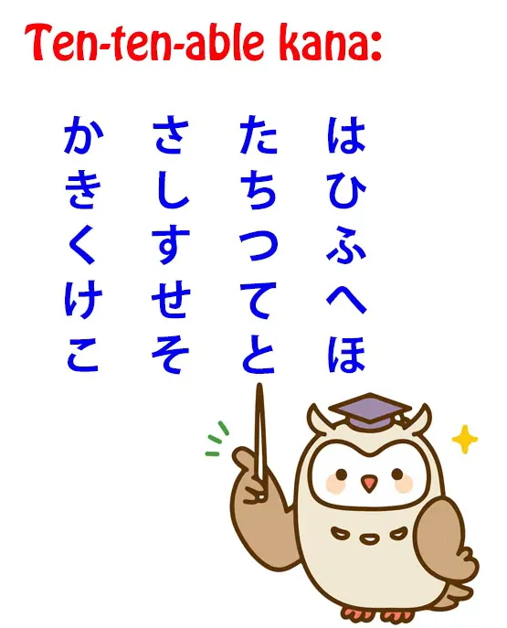 Ce sont la colonne た (ta), la colonne さ (sa), la colonne か (ka) et bien sûr la colonne は (ha), qui peut avoir un ten-ten pour devenir ba-bi-bu-be-bo ou un maru (゜) pour devenir pa-pi-pu-pe-po.