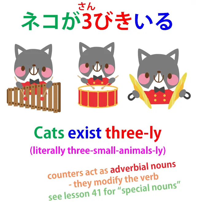 (Neko ga sanbiki imasu), nous disons en fait les chats, existent de manière trois-petits-animaux. Or, c'est très difficile en français, n'est-ce pas ? Nous pourrions le rendre un peu plus simple en disant les chats existent triplement ou les chats existent de manière triple, mais en fait, à cause du système de compteurs, nous disons les chats existent de manière trois-petits-animaux.
