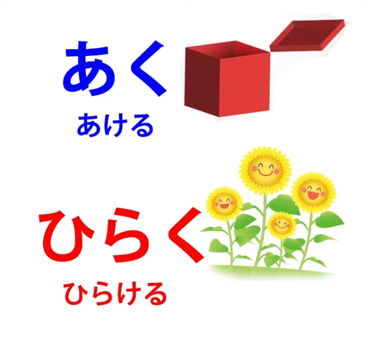 Ceux-ci se lisent respectivement あく (aku), あける (akeru), ひらく (hiraku), et ひらける (hirakeru), malgré le fait d'avoir le même kanji et le même okurigana. Dolly le clarifie plus tard dans la leçon.