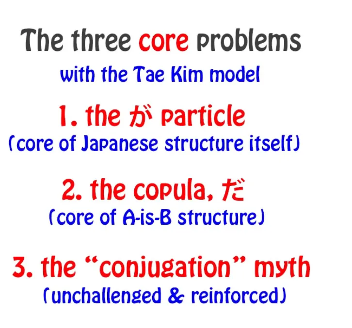 Encore une fois, je n'essaie pas de dénigrer Tae Kim-sensei. En fait, la raison pour laquelle je l'ai choisi est qu'il est la seule personne à avoir vraiment contesté le modèle Eihongo