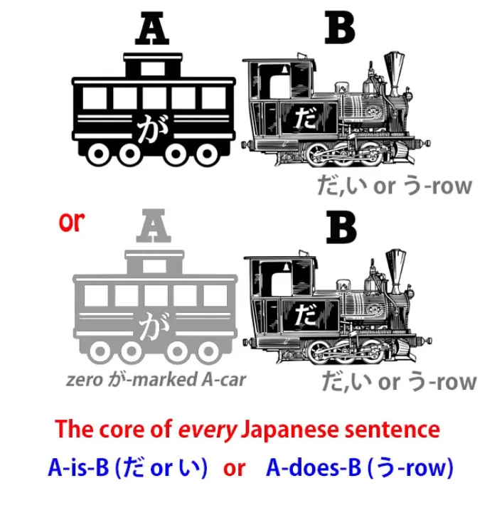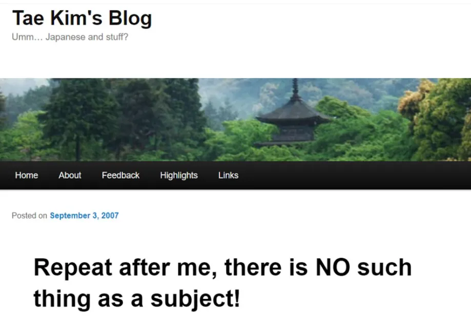 Maintenant, qu'est-ce qui pousse Tae Kim-sensei à déclarer que le japonais est si différent de toute langue humaine qu'il n'a pas de sujet ? Eh bien, ironiquement, c'est le fait qu'il ne peut pas se débarrasser de l'approche grammaticale Eihongo