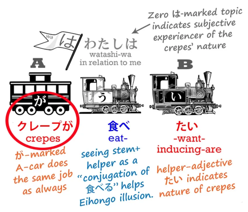 Et bien sûr, les crêpes sont marquées par が, et ce n'est pas le sujet, n'est-ce pas ? Donc が ne marque pas le sujet. Sur ce point, Tae Kim-sensei et le japonais Eihongo