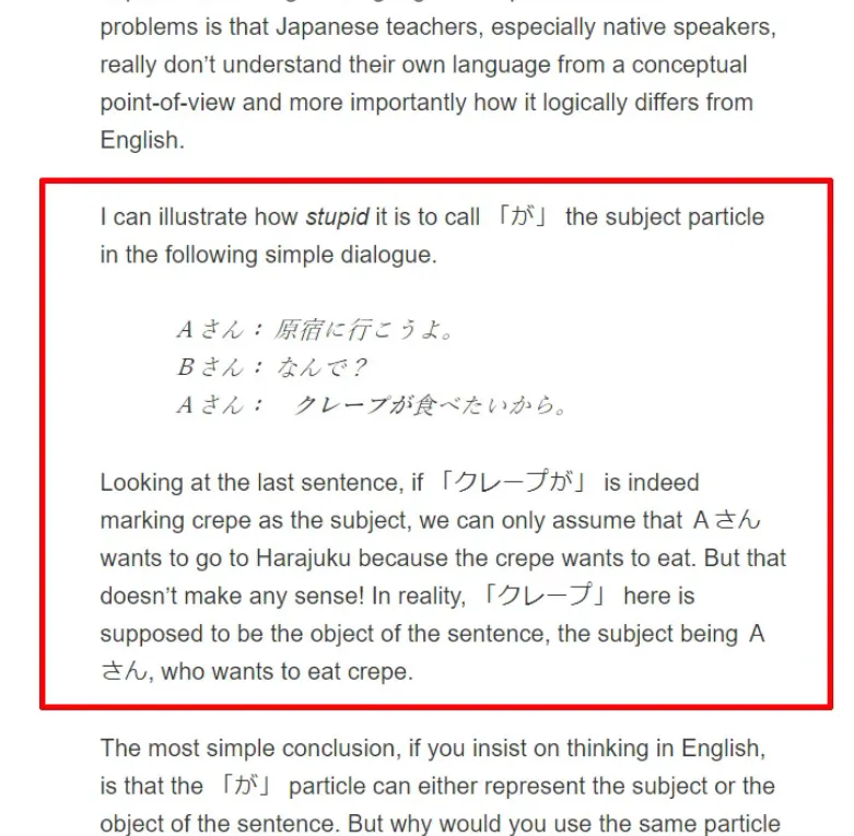 l'explique en disant que が ne marque que parfois le sujet. Tae Kim-sensei l'explique en disant qu'il n'y a pas de sujet dans la langue entière. Mais la simple raison de ces deux affirmations est une incapacité totale à même considérer le fait que le japonais pourrait utiliser des expressions différentes du français et qu'il pourrait être possible de retirer l'ego du centre d'une déclaration de subjectivité.