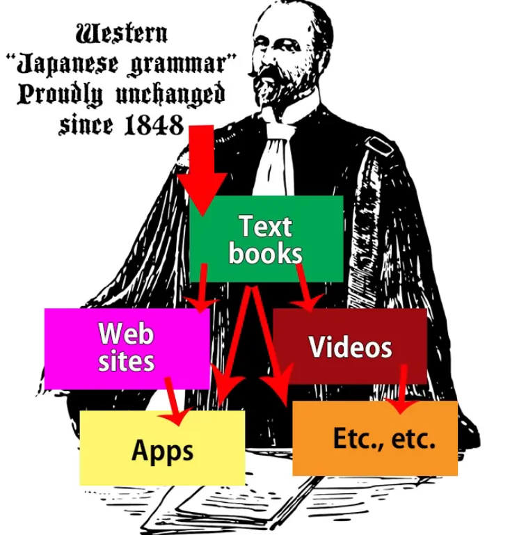 Maintenant, Tae Kim-sensei, dont nous allons parler aujourd'hui, a été assez intelligent et courageux pour voir les défauts fondamentaux des modèles japonais occidentaux conventionnels. Il a vu qu'ils étaient pleins de contradictions, d'incohérences et d'illogismes, et il a essayé de créer des modèles plus cohérents et plus logiques. Le problème est que dans les domaines les plus importants, ce qu'il a essentiellement fait a été de garder les morceaux qui étaient faux et d'essayer de concilier les morceaux qui étaient justes avec ceux-là.