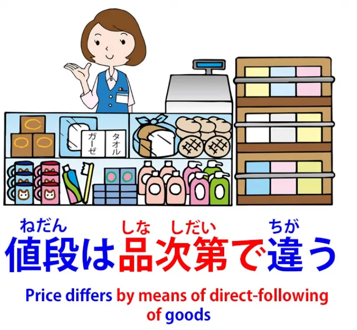 (nedan wa shina shidai de chigau), ce qui signifie littéralement le prix diffère **directement selon la marchandise**