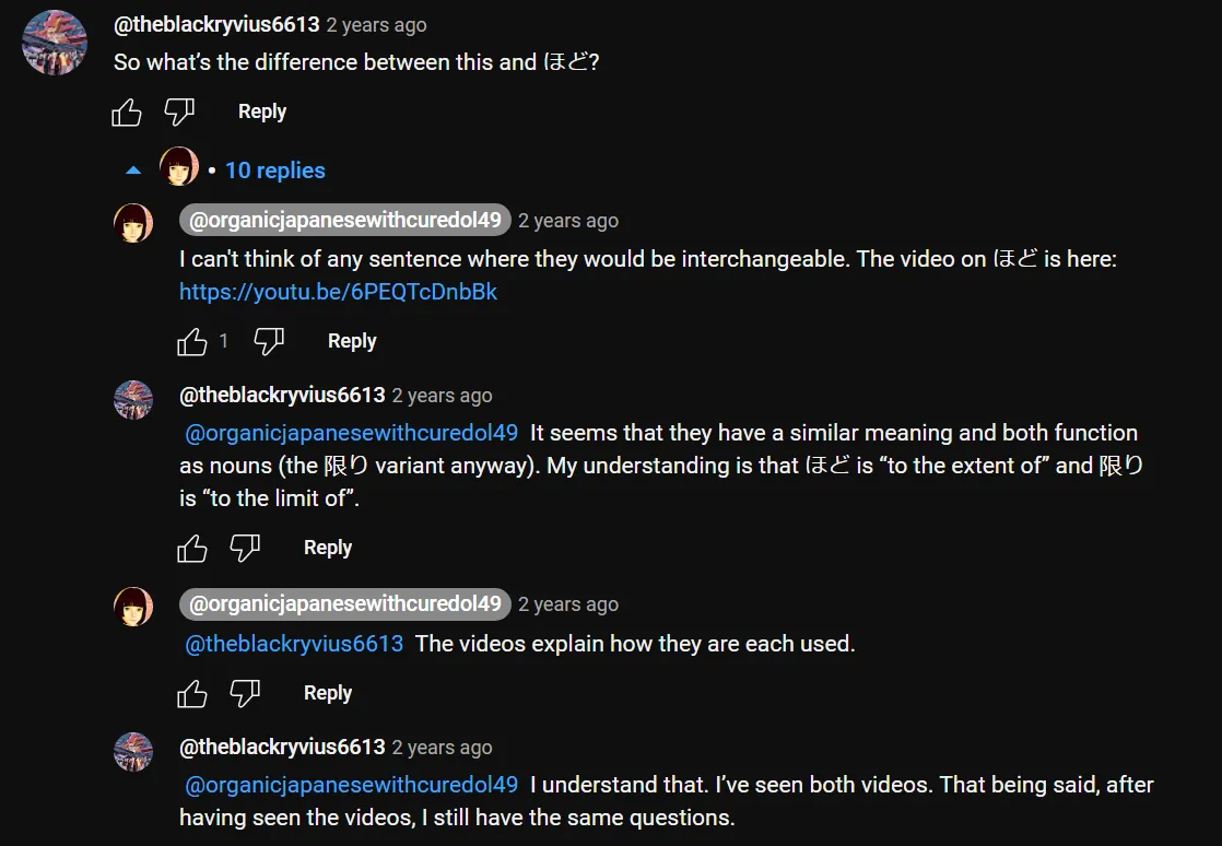Les liens auxquels il est fait référence sont くらい vs ほど et la Leçon 68 pour わけ (wake). Vous pouvez consulter d'autres commentaires sous la vidéo comme d'habitude. Quoi qu'il en soit, c'est là que la liste de lecture de Grammaire de Dolly de 93 vidéos se termine officiellement. Nous arrivons à la fin. Il y a encore quelques autres vidéos converties par Dolly en dessous de cela.*