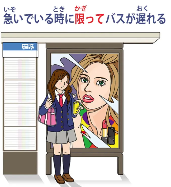(isoide iru toki ni kagitte basu ga okureru - limité aux moments où nous sommes pressés, le bus est en retard).