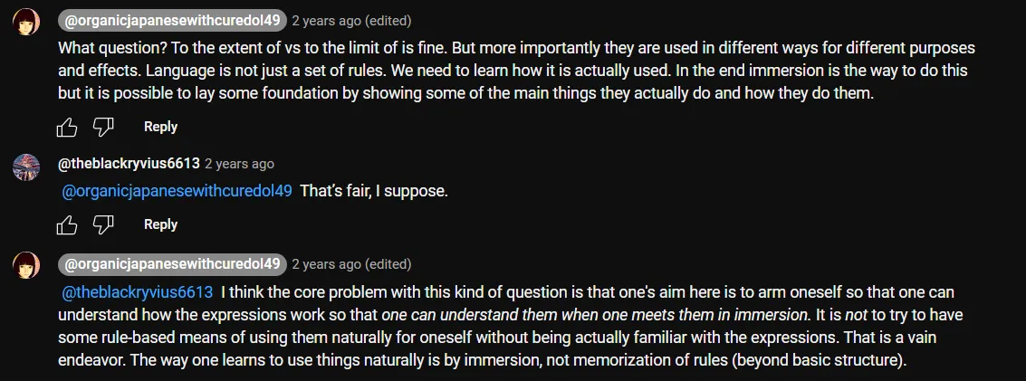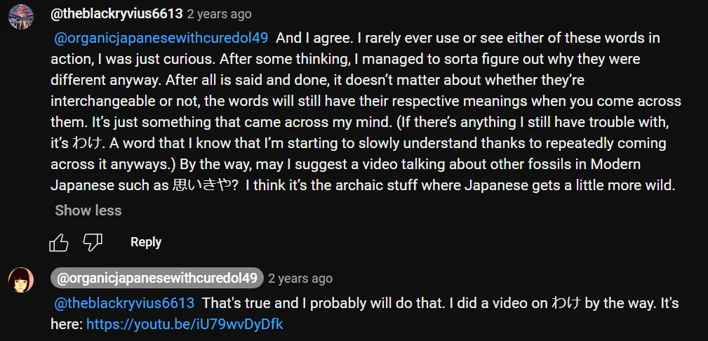 Si vous ne savez pas que les formes en い créent des formes nominales, je vais lier une vidéo au-dessus de ma tête qui vous révélera tous les secrets de la mystérieuse forme en い.[72]